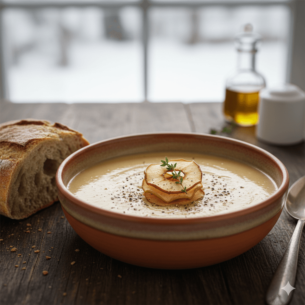 This soup uses Celeriac, Onions, and Dessert Apples (Adam's Pearmain) for a silky, sophisticated winter warmer. The apple cuts through the nuttiness of the celeriac beautifully.