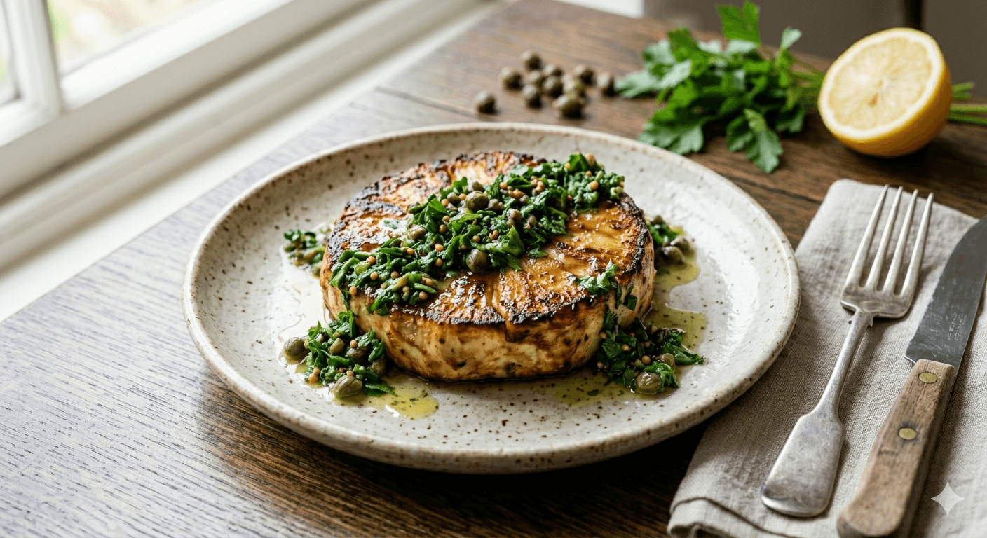 In this recipe, you roast the celeriac whole in its skin first essentially steaming the vegetable in its own juices, concentrating the flavour. The skin acts as a natural pressure cooker, ensuring the texture is incredibly silky before you give it that final, crispy pan-sear. We have paired this with a Salsa Verde. The acidity of the herbs cuts perfectly through the buttery richness of the roasted root.